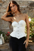 The Irene White Tweed Bustier Top brings sophisticated glamour to your modern wardrobe with luxurious tweed fabric accented by elegant black sequins. This structured bustier top features built-in cups for flattering support and a sleek back zipper with hook-eye closure for a polished, secure fit. Perfect for the fashion-forward woman who loves statement pieces, this white tweed top pairs beautifully with high-waisted trousers, tailored skirts, or denim for versatile day-to-evening styling. The non-stretch tweed fabric with black sequin detailing creates a premium editorial look, while the fully lined interior ensures comfortable all-day wear. Style this bustier top tucked into wide-leg pants for sophisticated evening events, or layer under blazers and structured jackets for contemporary office-to-cocktail transitions.