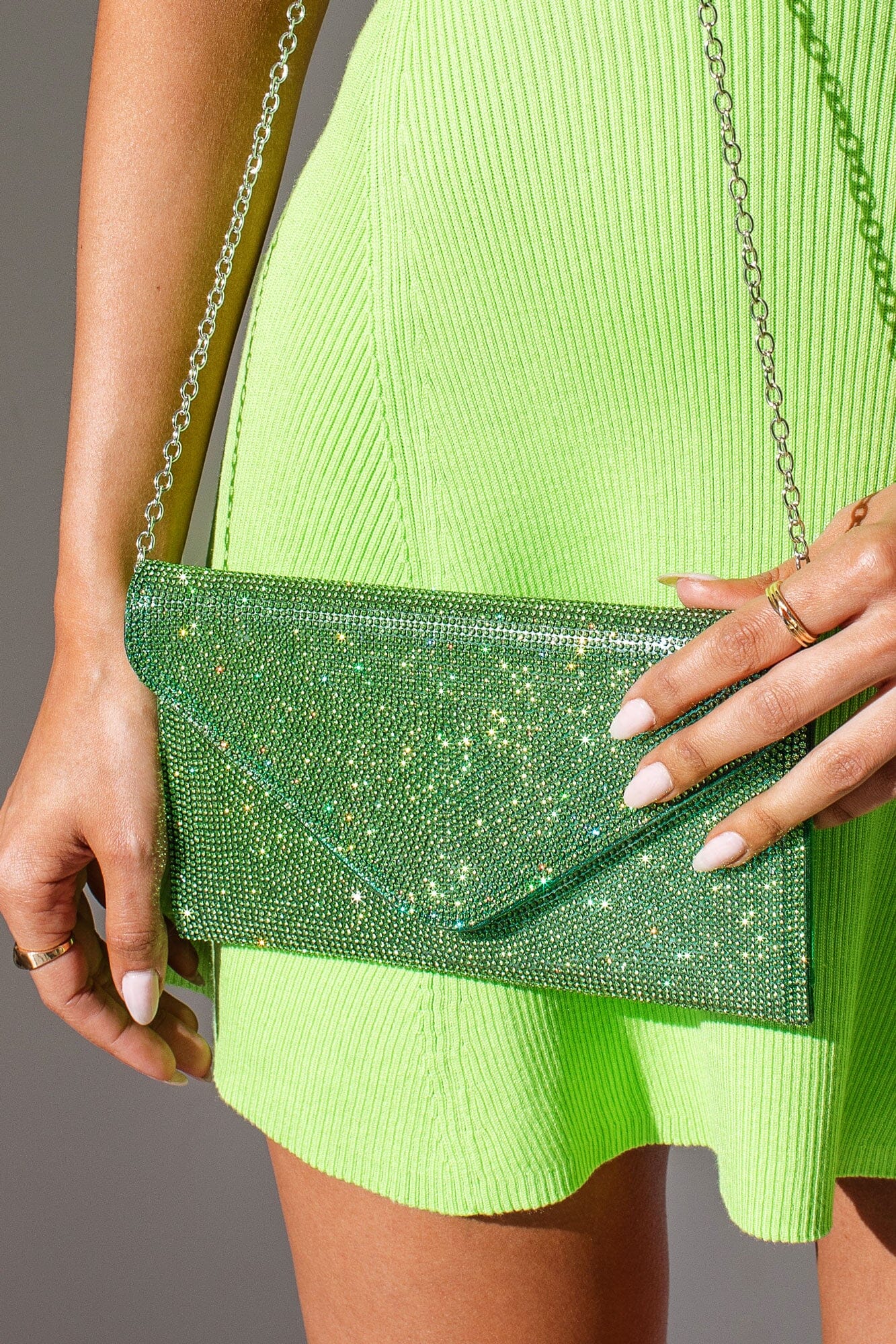 Not to be dramatic, but everyone needs this clutch! The Quentin Green Rhinestone Envelope Purse features a green rhinestone and vegan leather fabric, a green satin lining, a green vegan leather back, a silver detachable shoulder chain, a snap button closure, and an inside card holder.