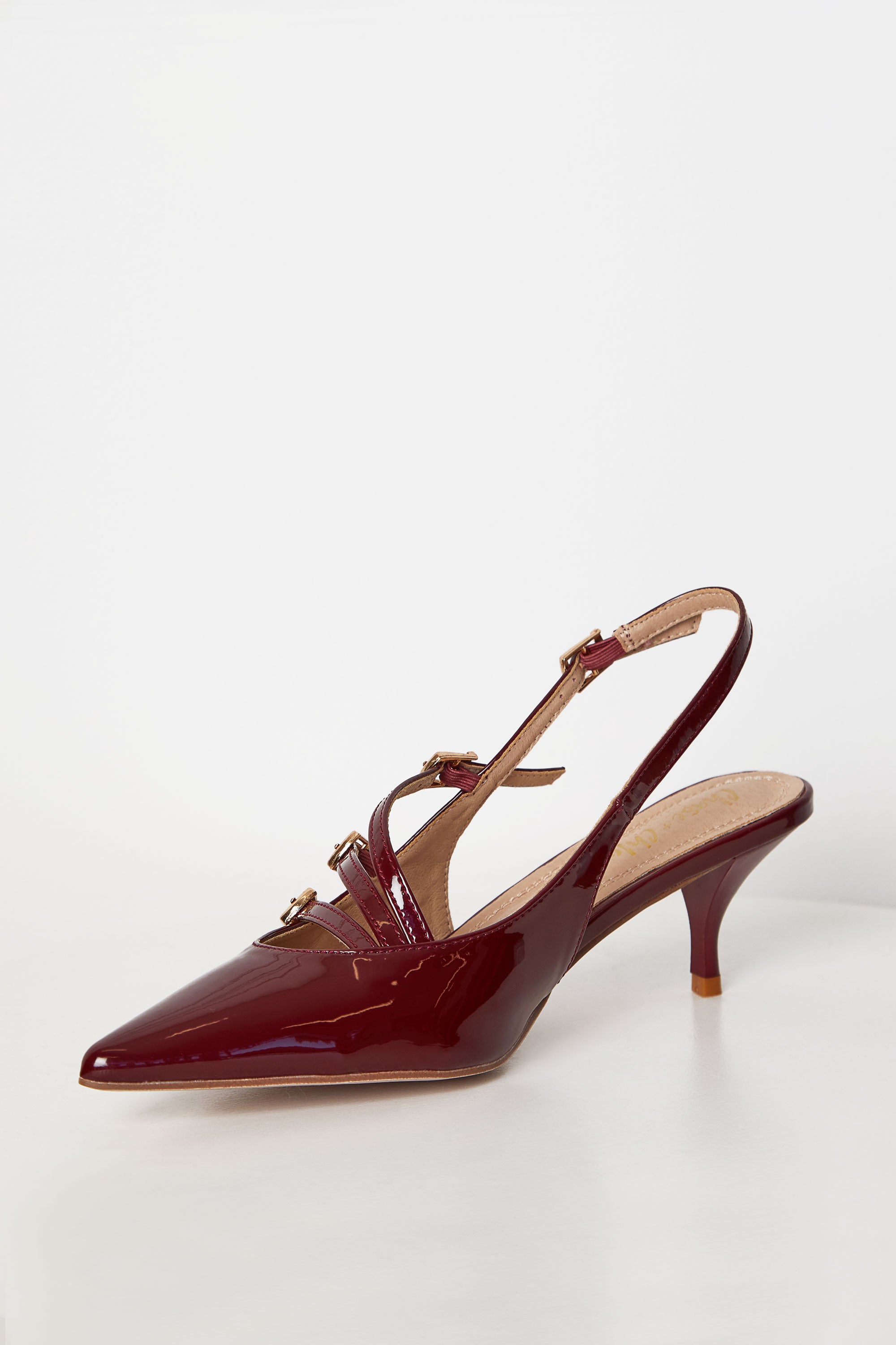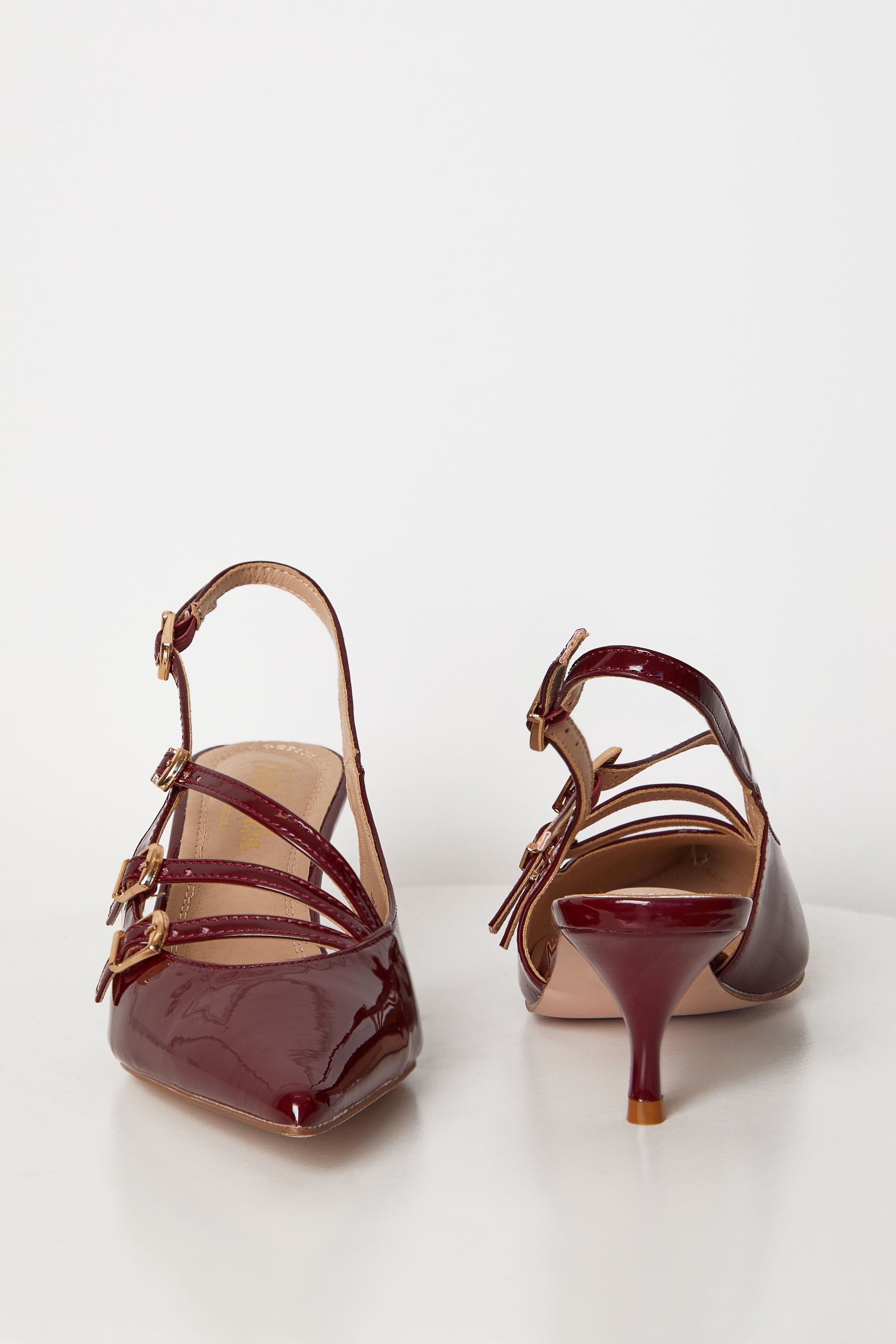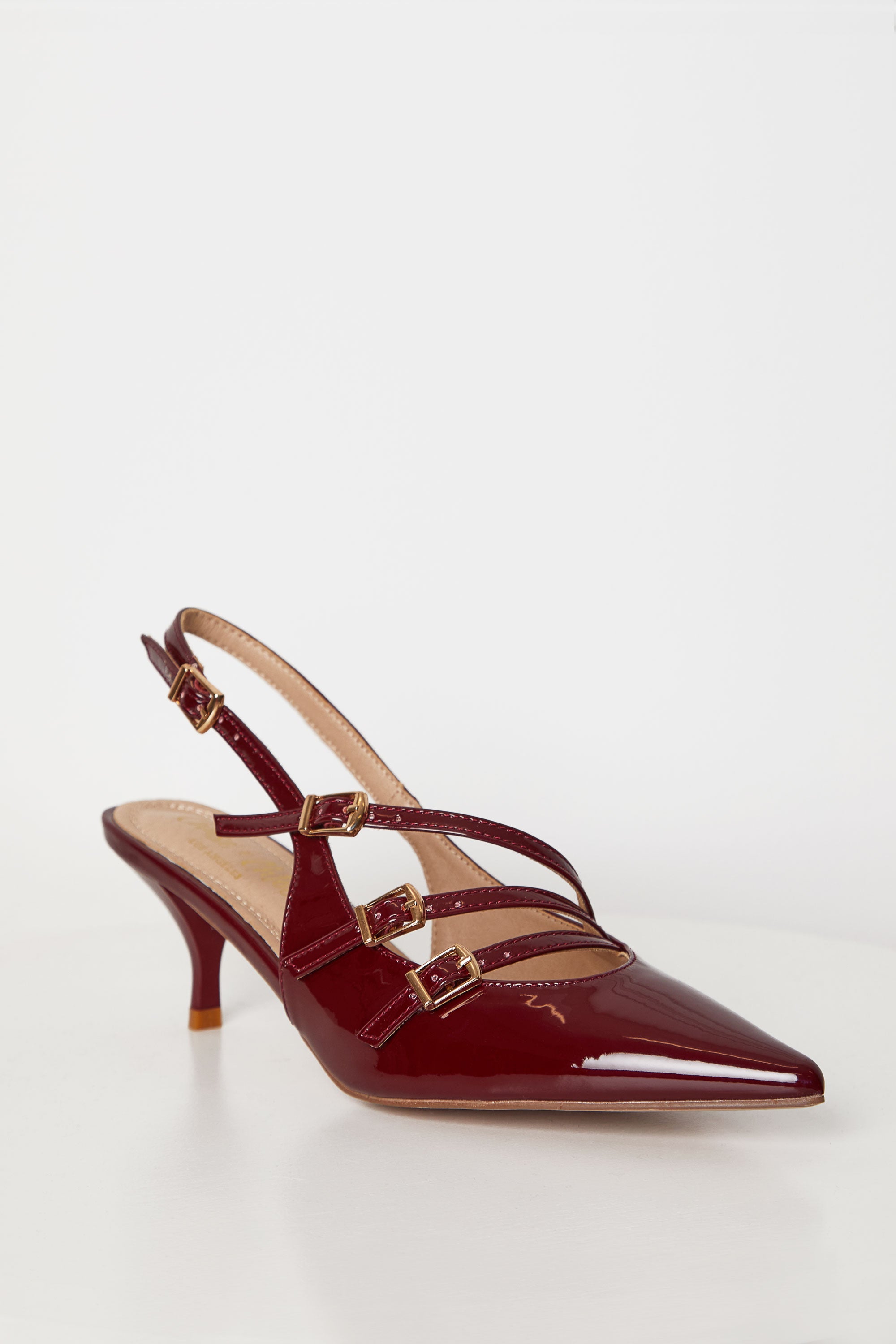 Indulge in pure sophistication with our Shirley Cherry Red Patent Kitten Heels. Featuring designer-inspired style, the patent leather and buckle detailing exude elegance. The kitten heel and secure buckle closure provide comfort and style. Elevate your look with these exclusive heels.