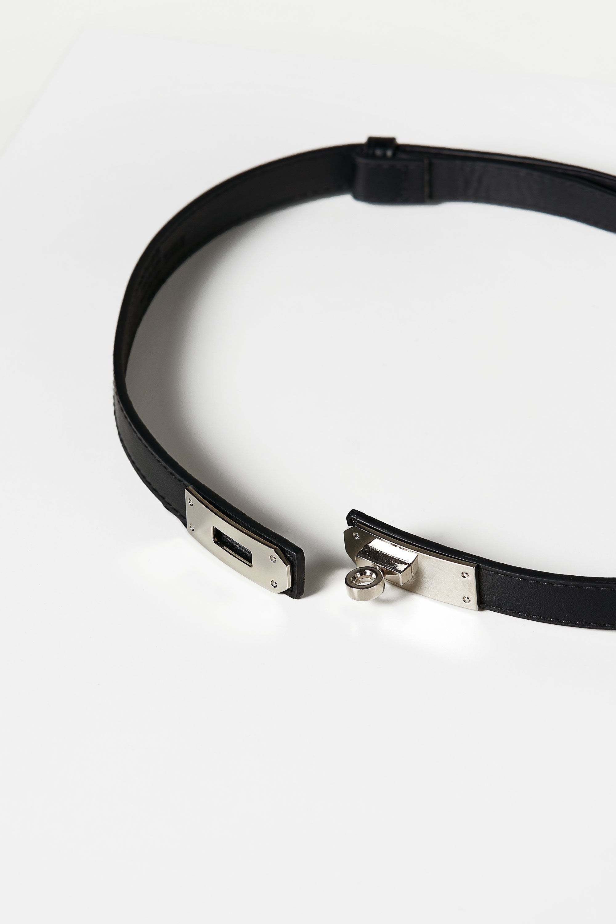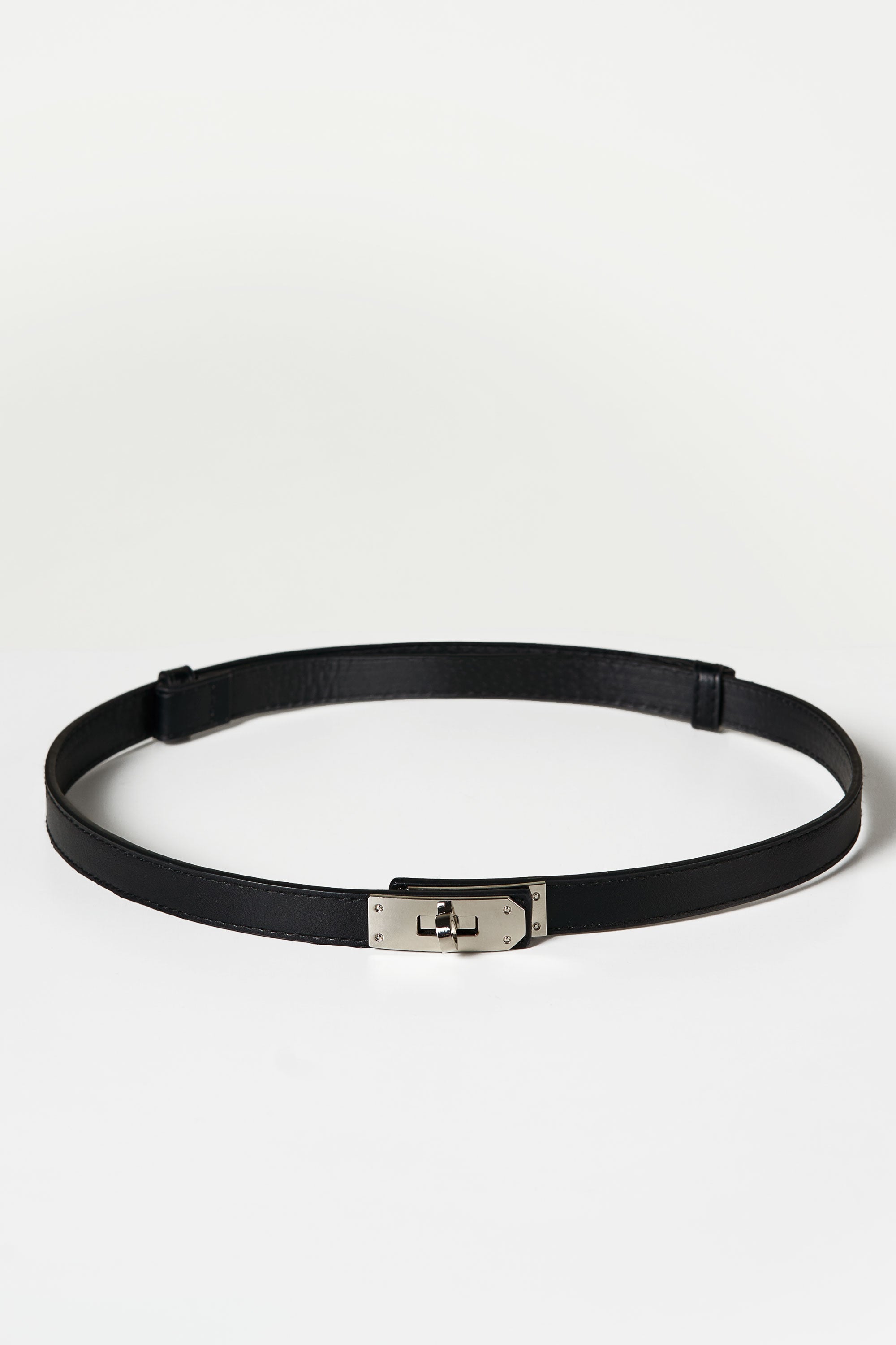 Step up your style game with our Romina Black Belt! This designer inspired skinny belt features a turn key latch for a secure and stylish fit. Dress up any outfit with this versatile accessory. (Belt on point!)