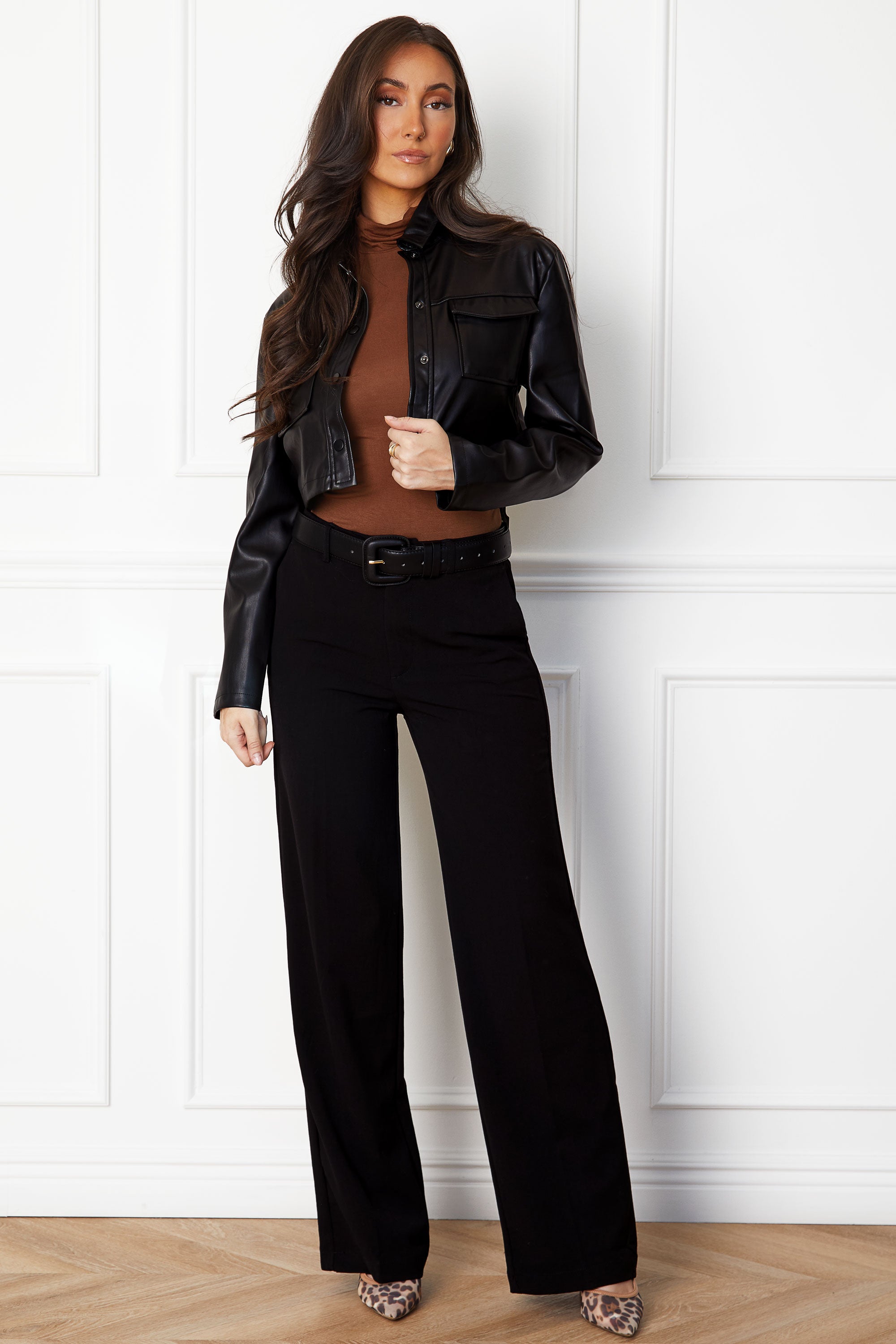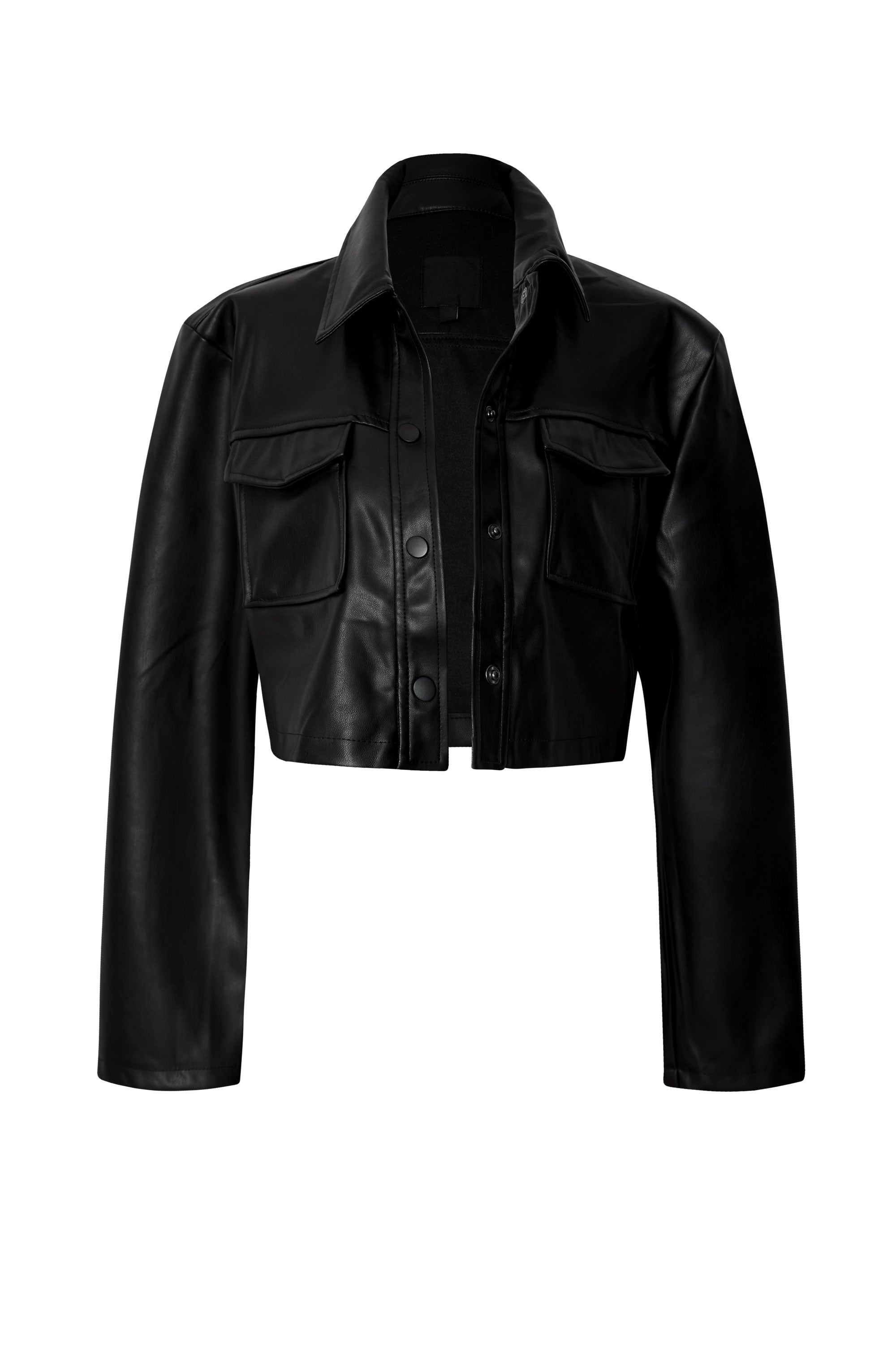 Elevate your look with the Irma Black Vegan Leather Cropped Jacket. Its edgy and cool design, crafted from premium vegan leather, will add a touch of sophistication to any outfit. Pair with high waisted pants for a stylish and trendy ensemble.