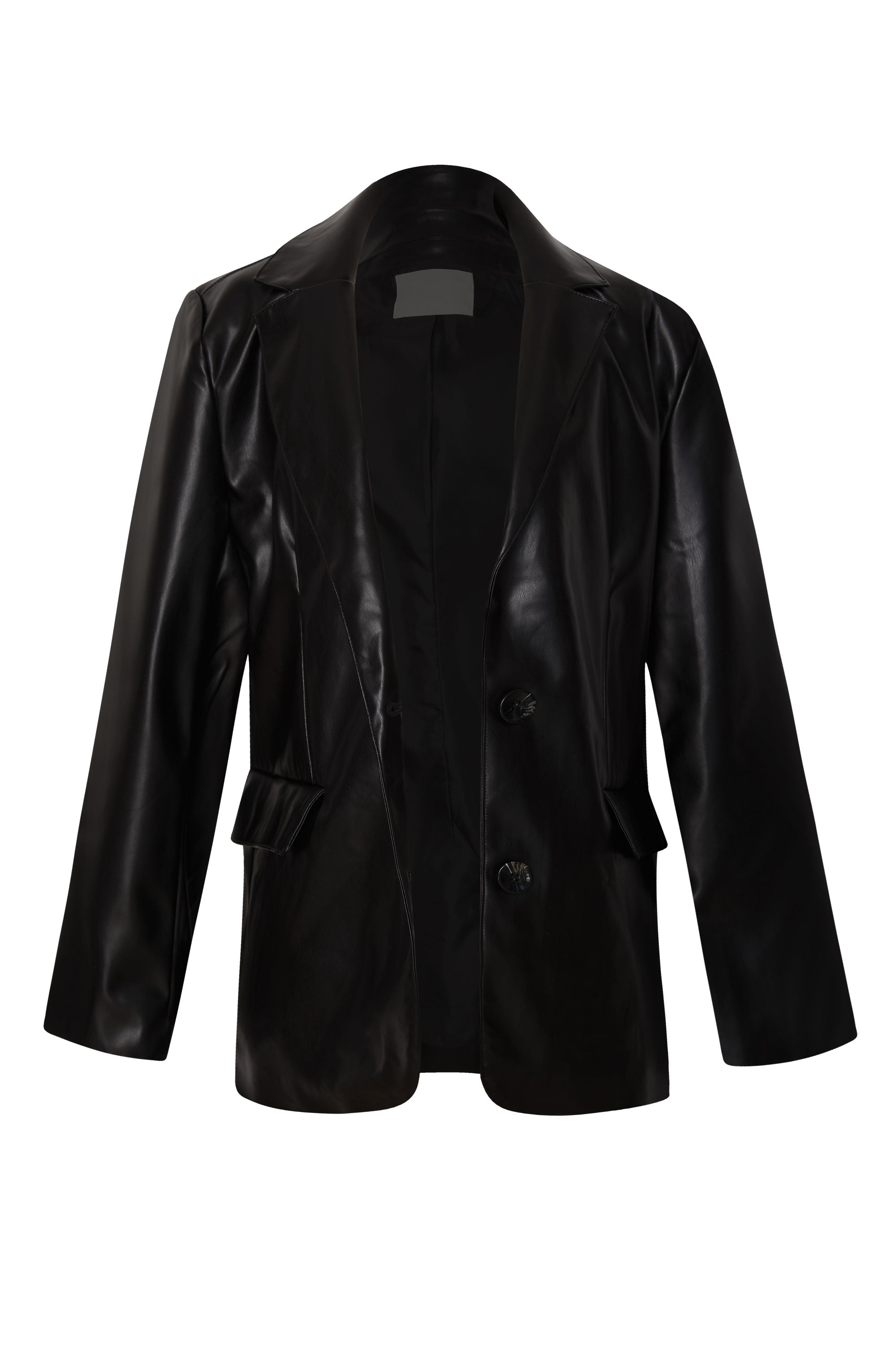 Elevate your wardrobe with the Jasper Black Vegan Leather Blazer. Crafted from ultra-chic vegan leather, this blazer exudes elegance and sophistication. Perfect for any occasion, it adds a touch of luxury to any outfit. Upgrade your style with this must-have piece.