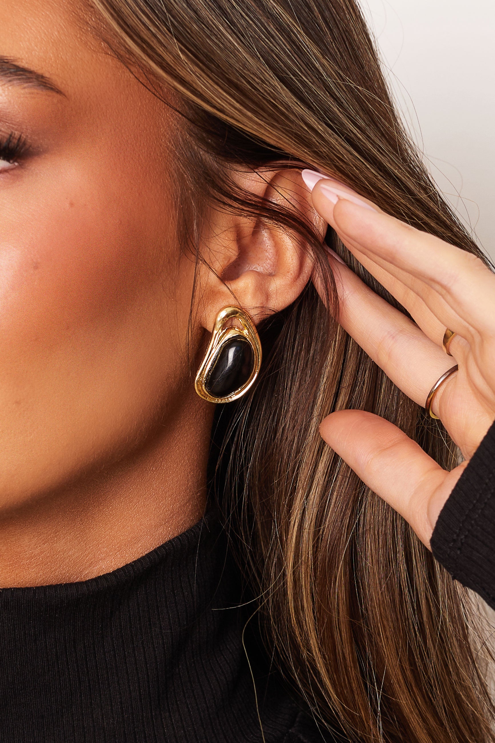 - Gold-tone metal earrings with black onyx-tone center