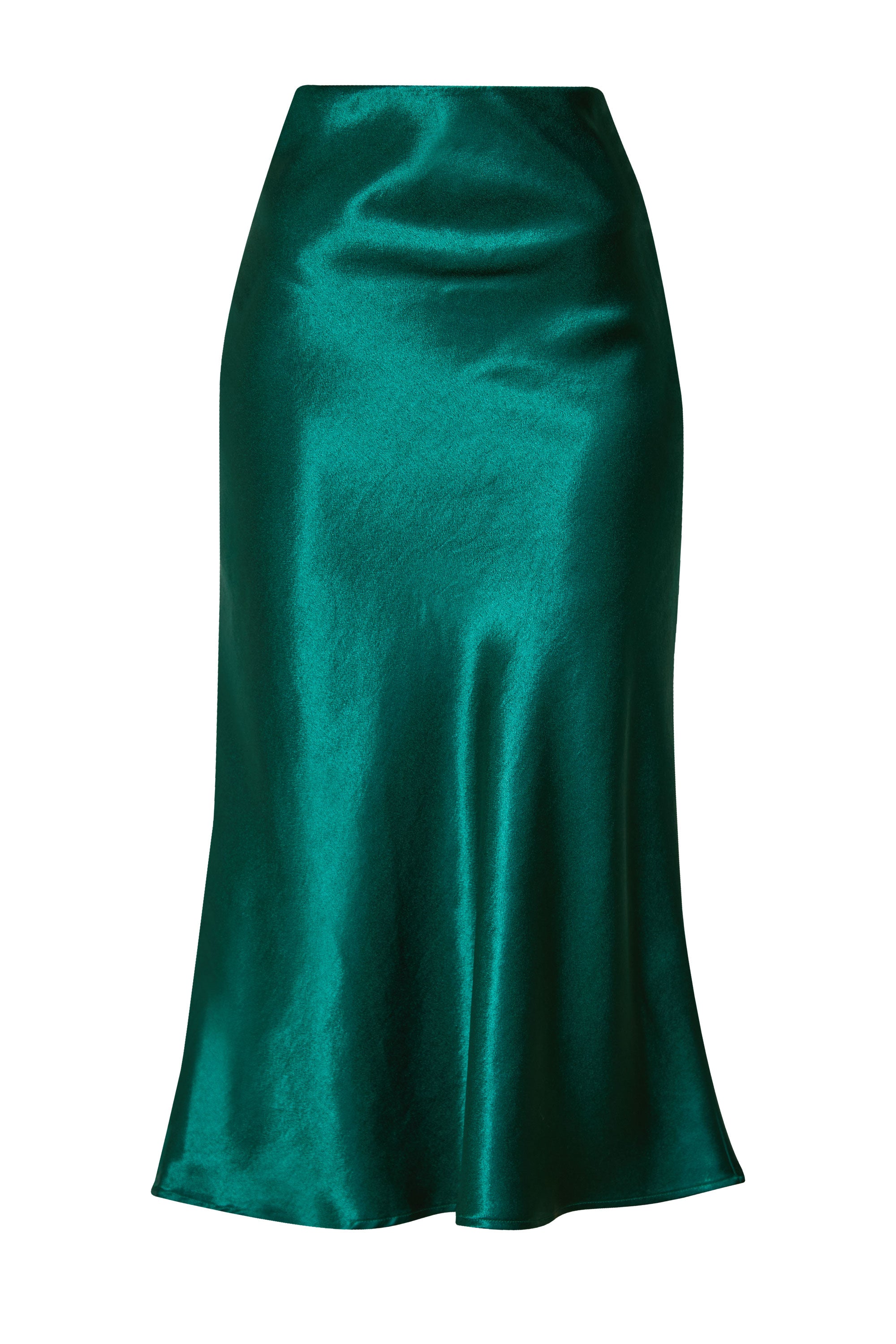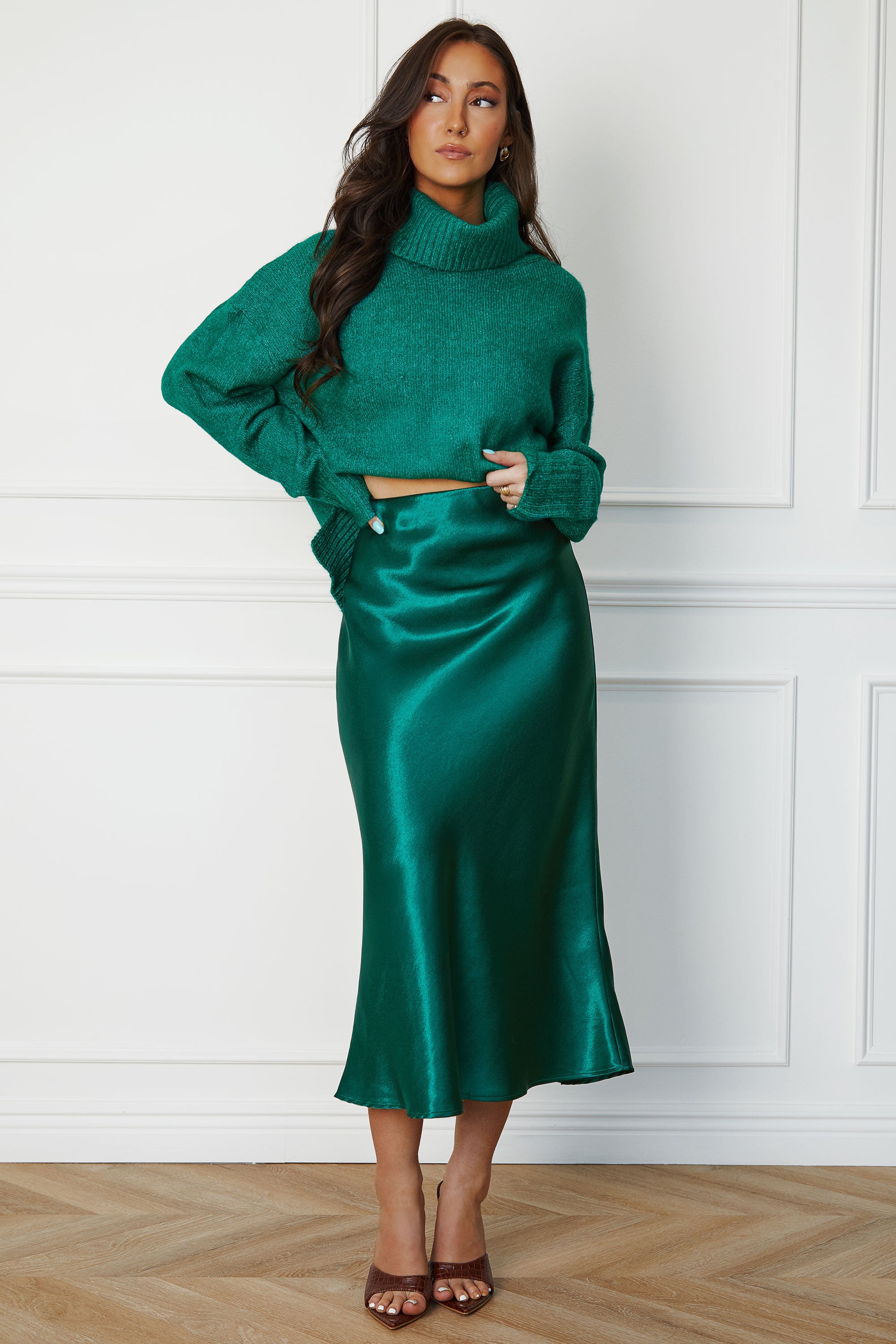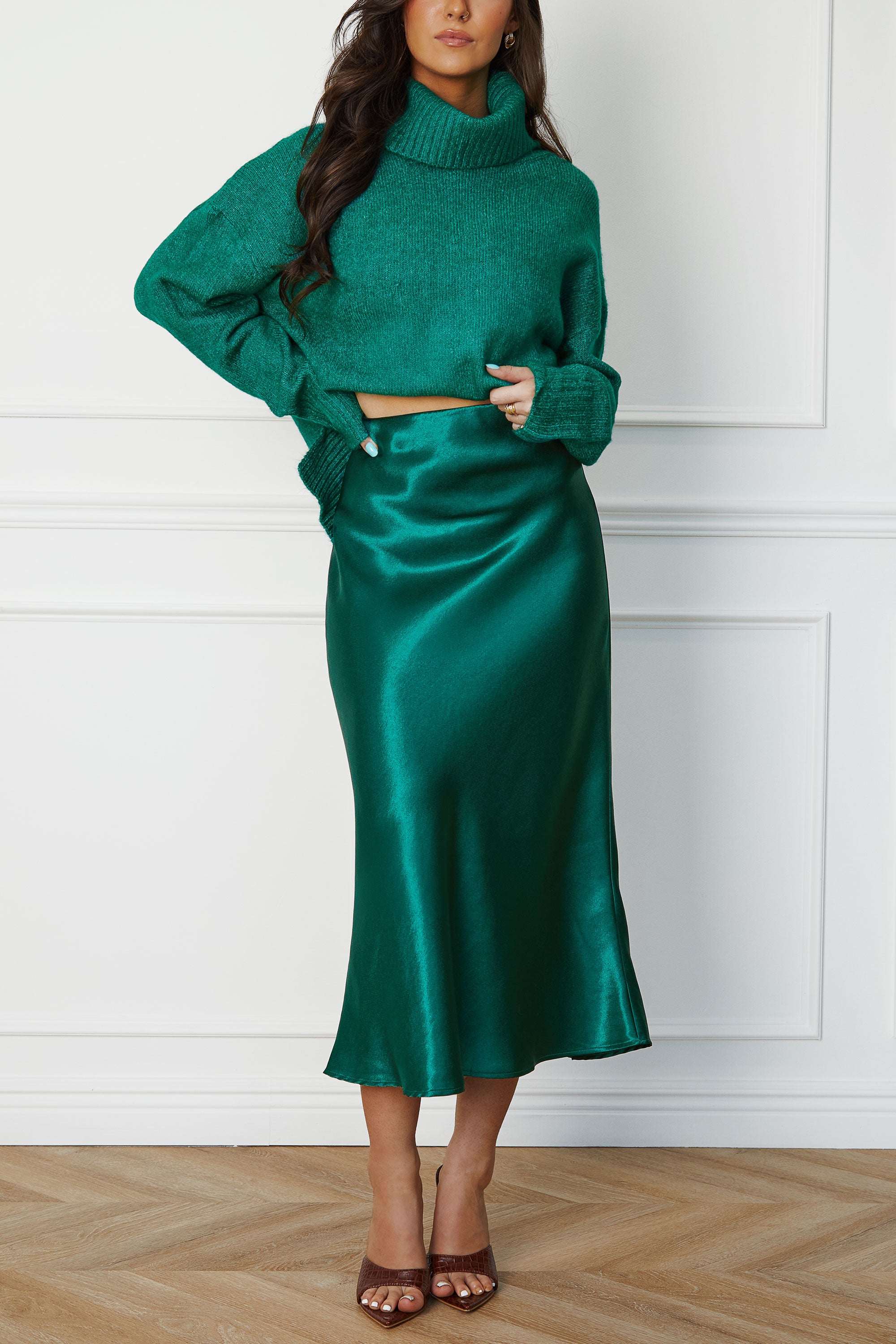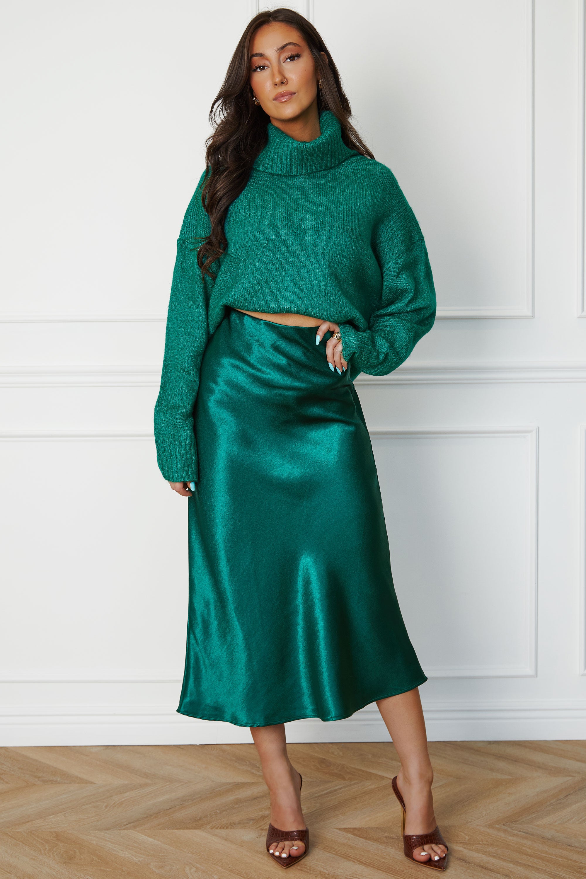 Introducing our Eira Dark Green Satin Maxi Skirt, designed for the sophisticated and exclusive woman. Its elegant satin fabric drapes beautifully and features a stretch waist for a comfortable and effortless pull-on style. Elevate your wardrobe with this luxurious and versatile piece.