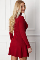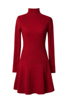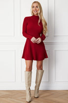 3 reviewsIndulge in luxury with the Ellen Wine Mock Neck Long Sleeve Sweater Dress. Crafted from a soft, knit material, this dress features a gorgeous mock neck and subtle flare skirt, creating a sophisticated and elegant silhouette. Perfect for any occasion, this dress exudes tastefulness and exclusivity.