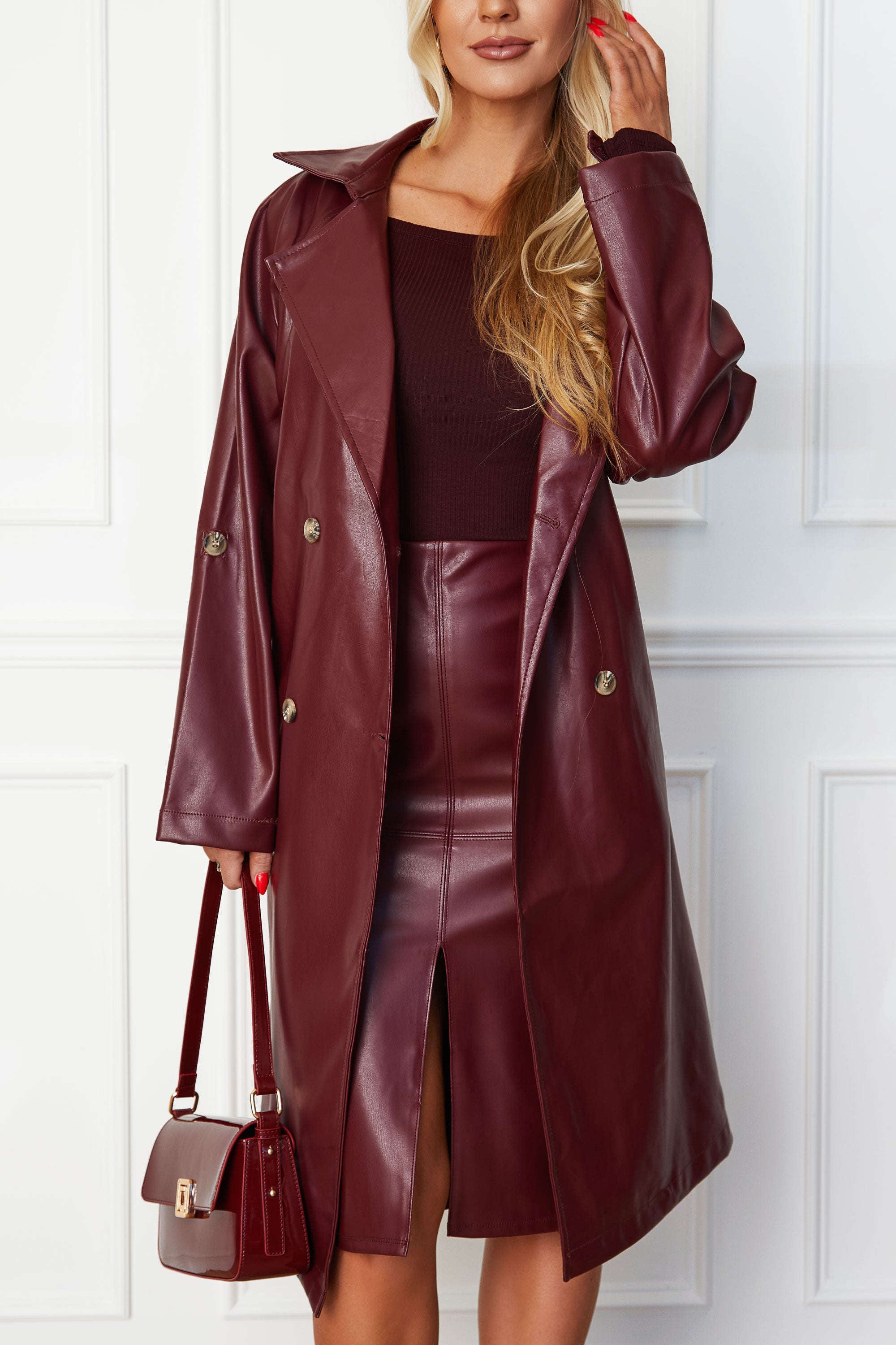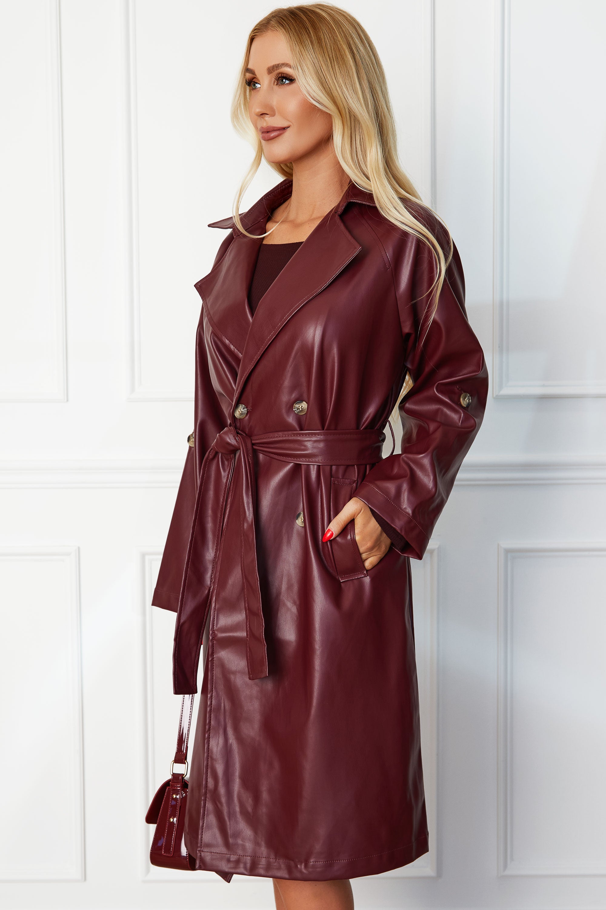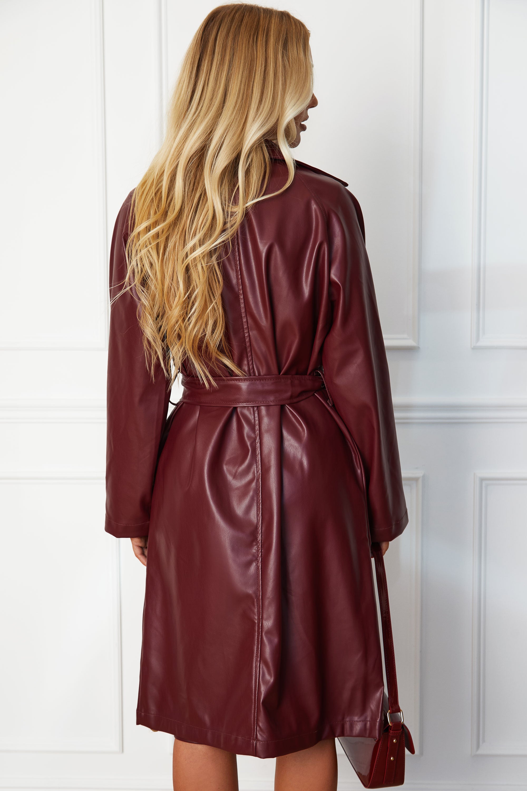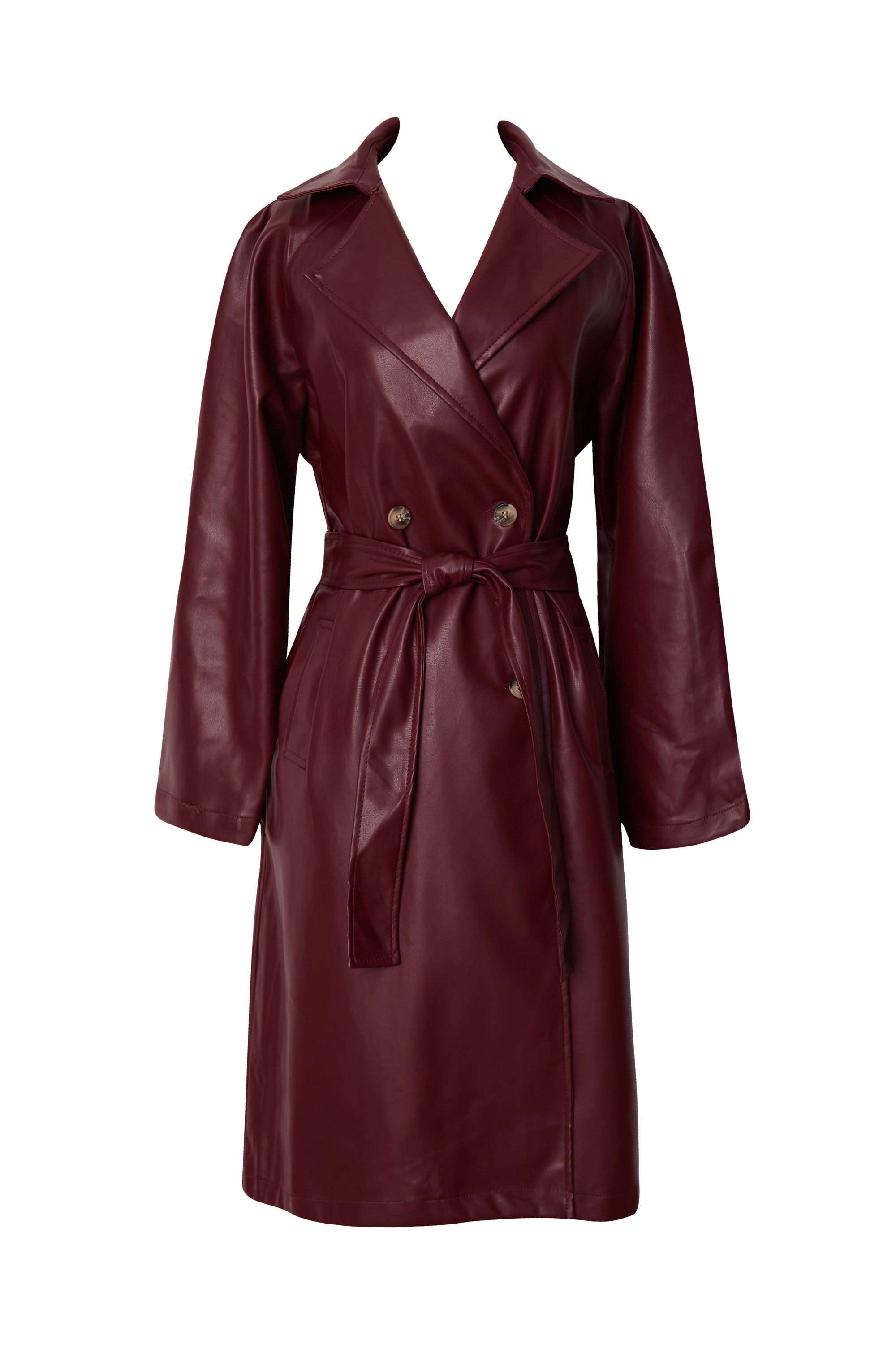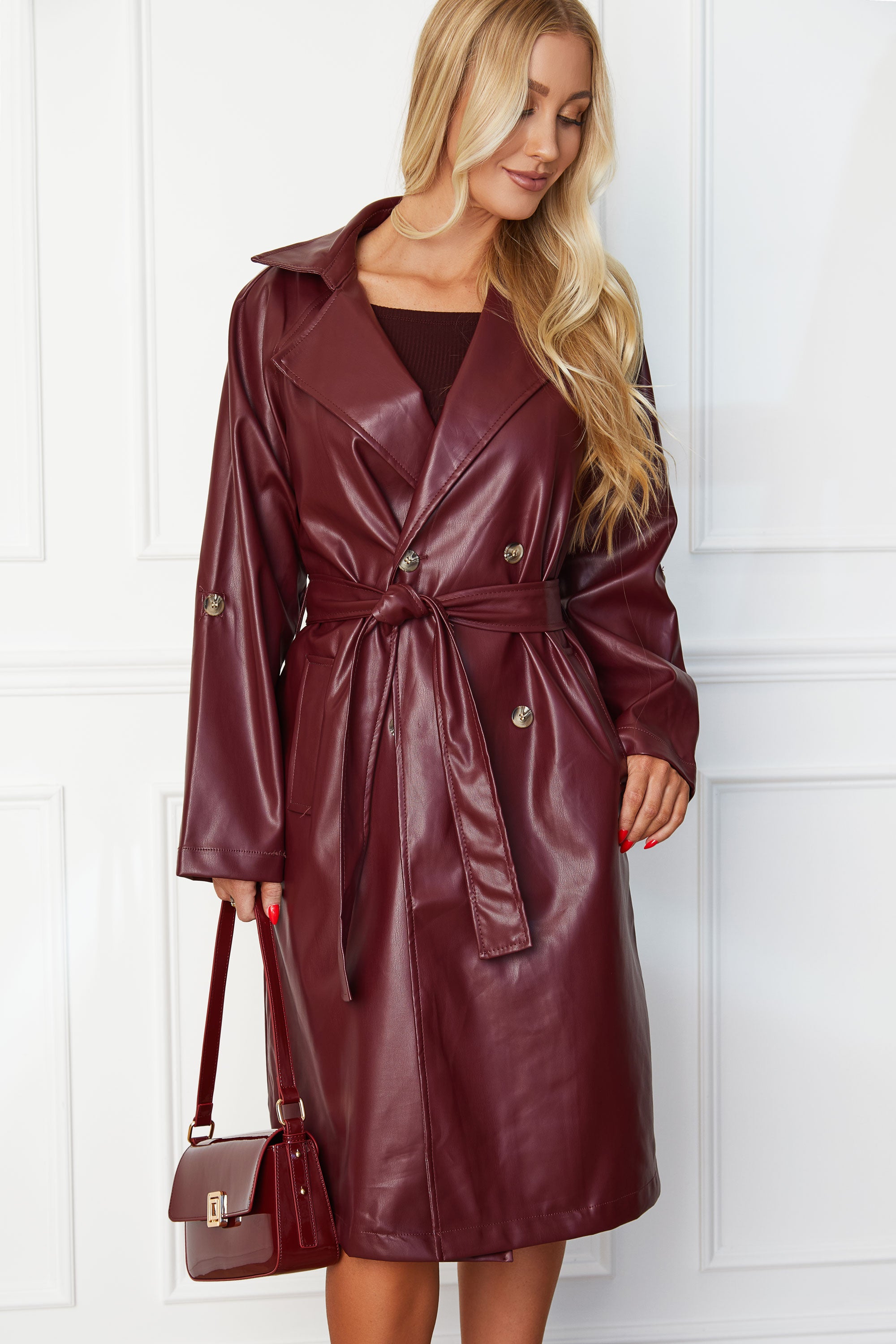 1 reviewWrap yourself in luxurious style with our Elsa Wine Vegan Leather Trench Coat. Crafted from elegant vegan leather in a stunning wine shade, this coat is both chic and cruelty-free. Complete with convenient pockets and a leather tie, it's the perfect blend of fashion and function. Elevate your wardrobe with this sophisticated piece.