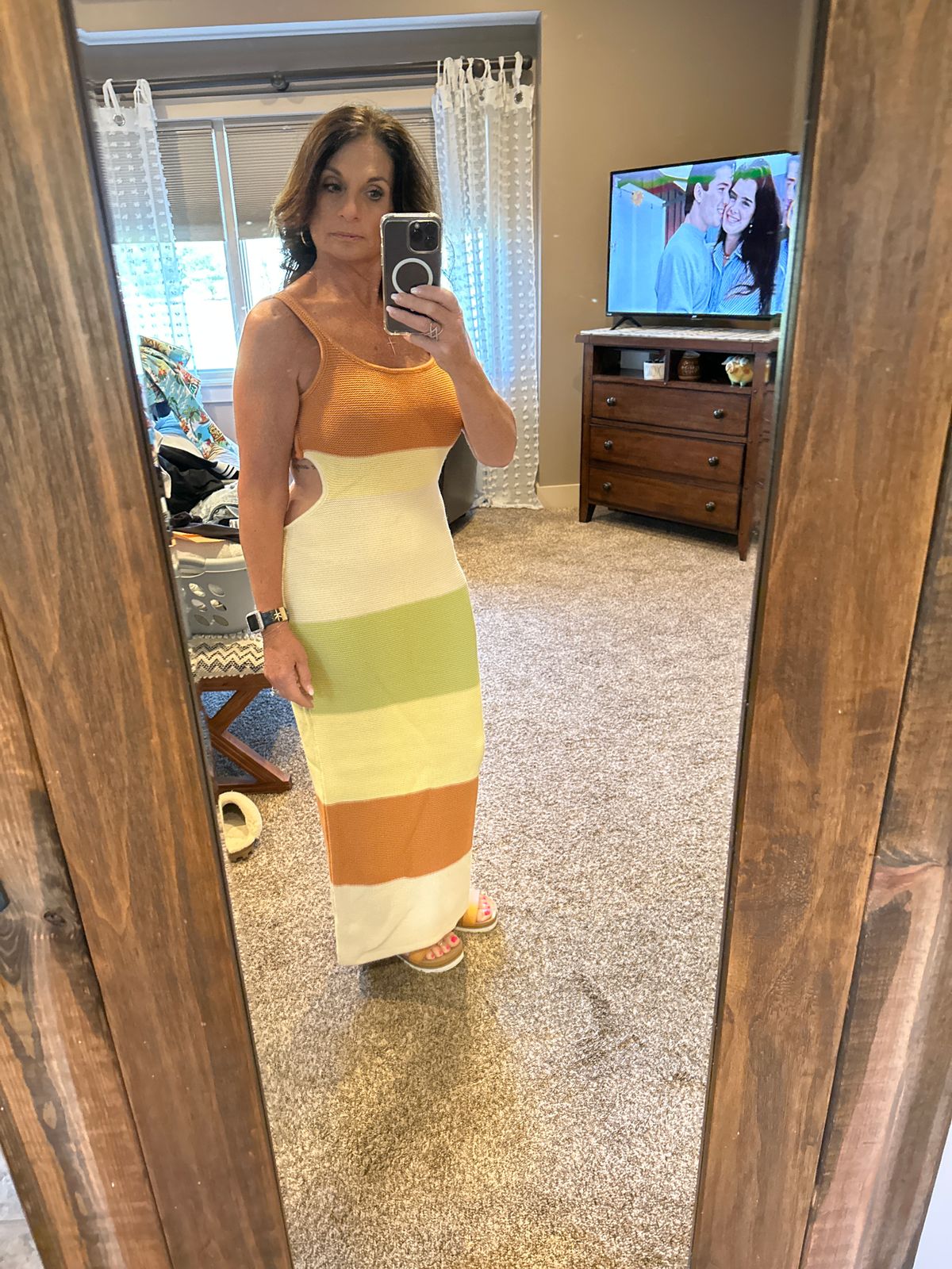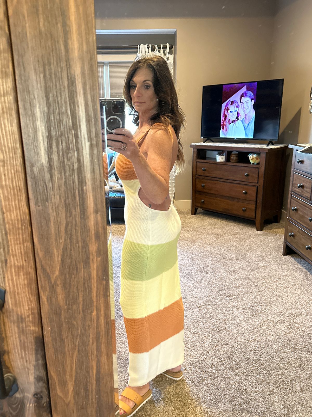 Dress is extremely comfortable. Little longer then I expected but I’m also only 5’2”. Excited to wear this summer. I wish I had ordered sooner to take on vacation. I had to buy a large instead of Medium but it worked out maybe a little less clingy.