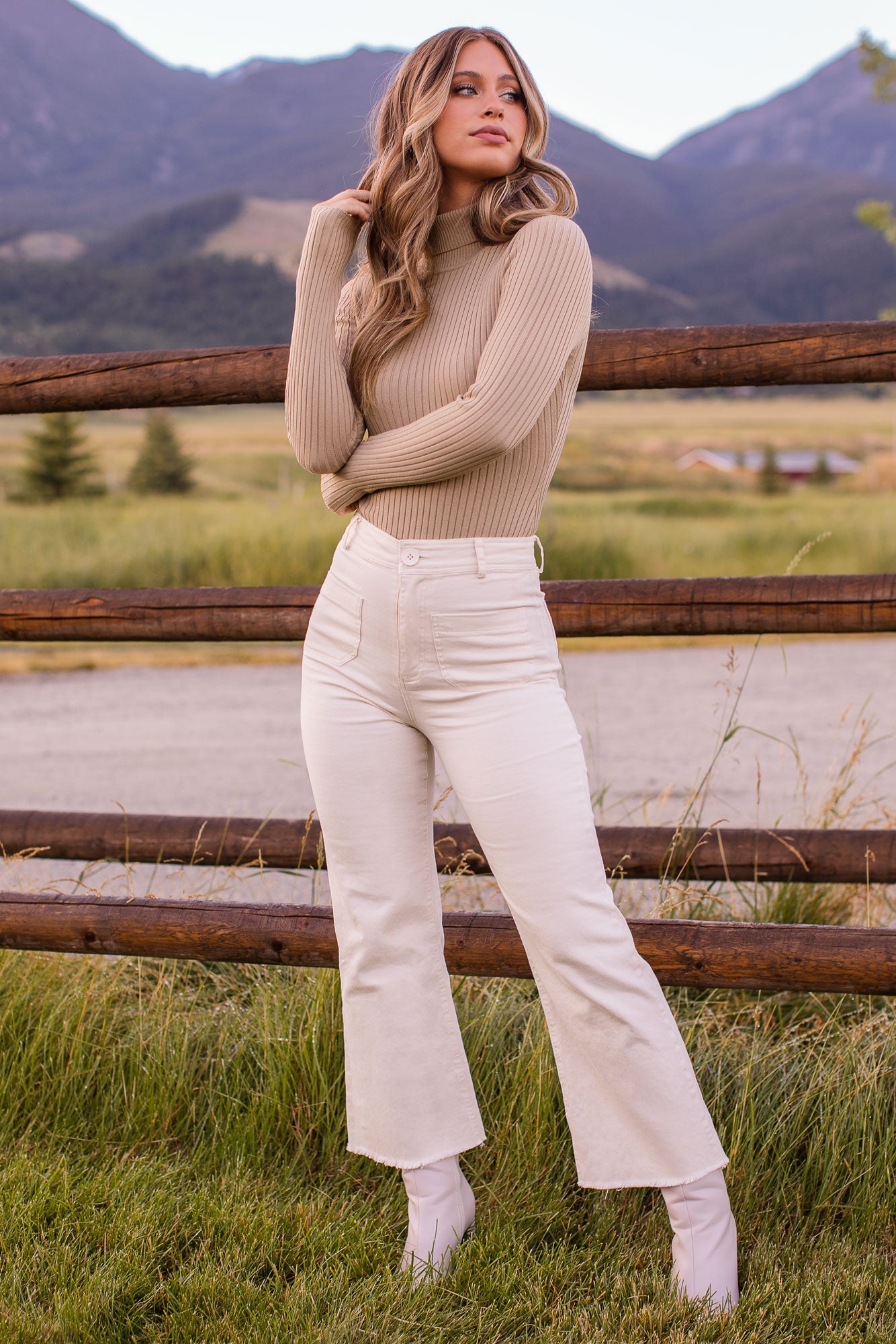 A seasonal staple for all your cozy layered looks. Introducing our Too True Khaki Ribbed Turtleneck Bodysuit made of thick rib-knit sweater fabric with a fitted body and long sleeves. Featuring a folded turtleneck and thong-style silhouette at the bottom with two snap closures.