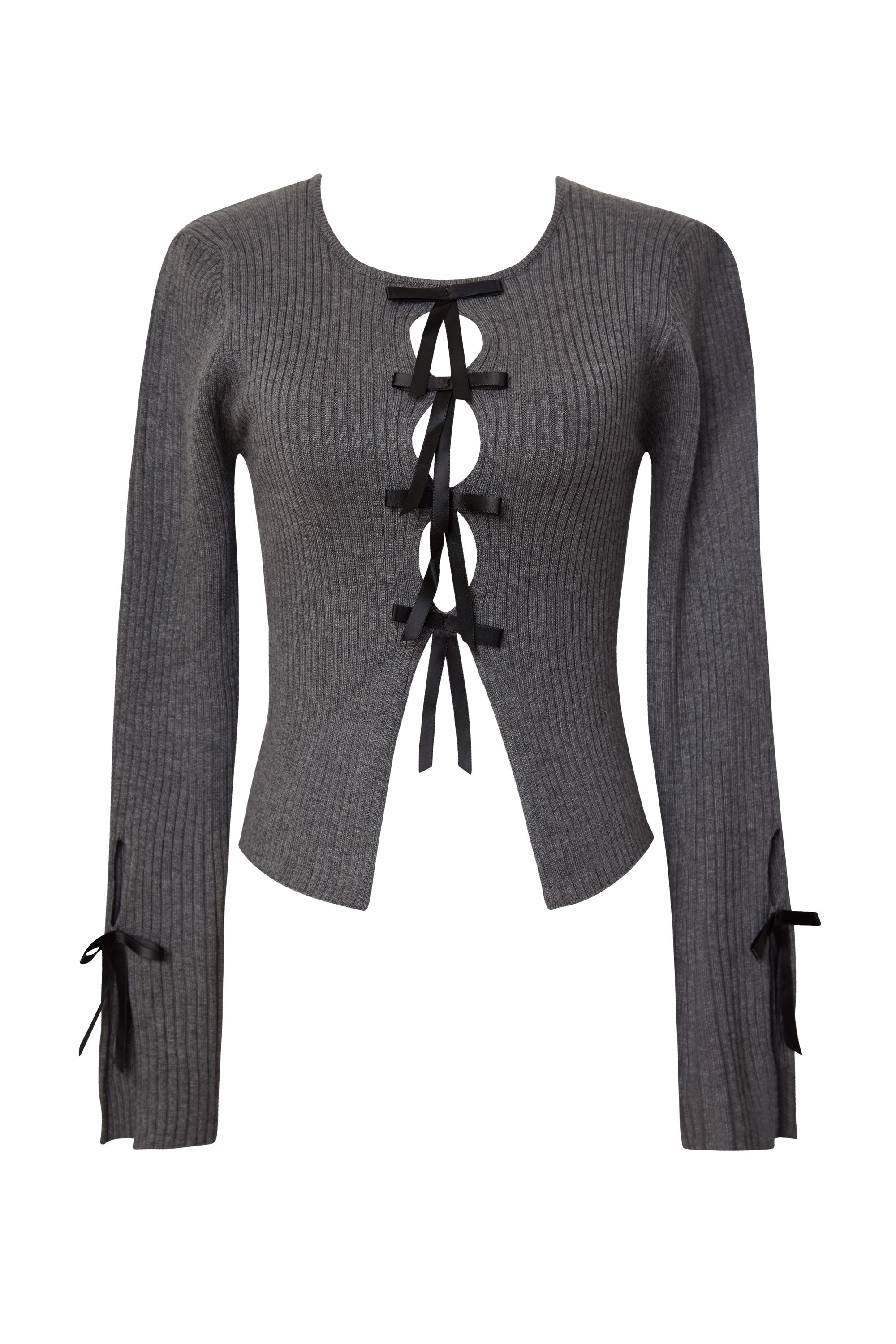 Indulge in the sweet and feminine aesthetic of the Aisling Heather Grey Ribbon Sweater. With delicate bow detailing, this sweater exudes elegance and charm. Perfect for adding a touch of sophisticated luxury to your wardrobe.