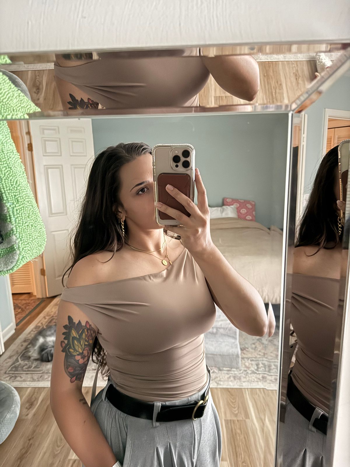 This too is perfect. I don’t even have to wear a bra with it and I’m a DDD cup. It’s super soft, supportive, cinches the waist, and the off-shoulder look is so timeless. This is the kind of top you immediately rip the tag off and wear out.