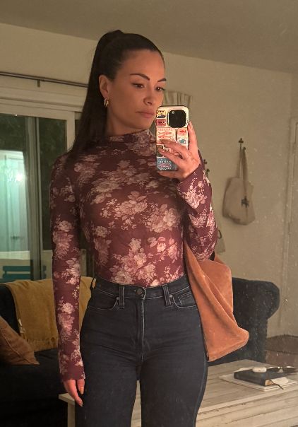 This bodysuit is super high-quality. Sometimes mesh tops can be scratchy, but this one is soft and really feels like a second skin. Super flattering with a brown bra/bandeau underneath.